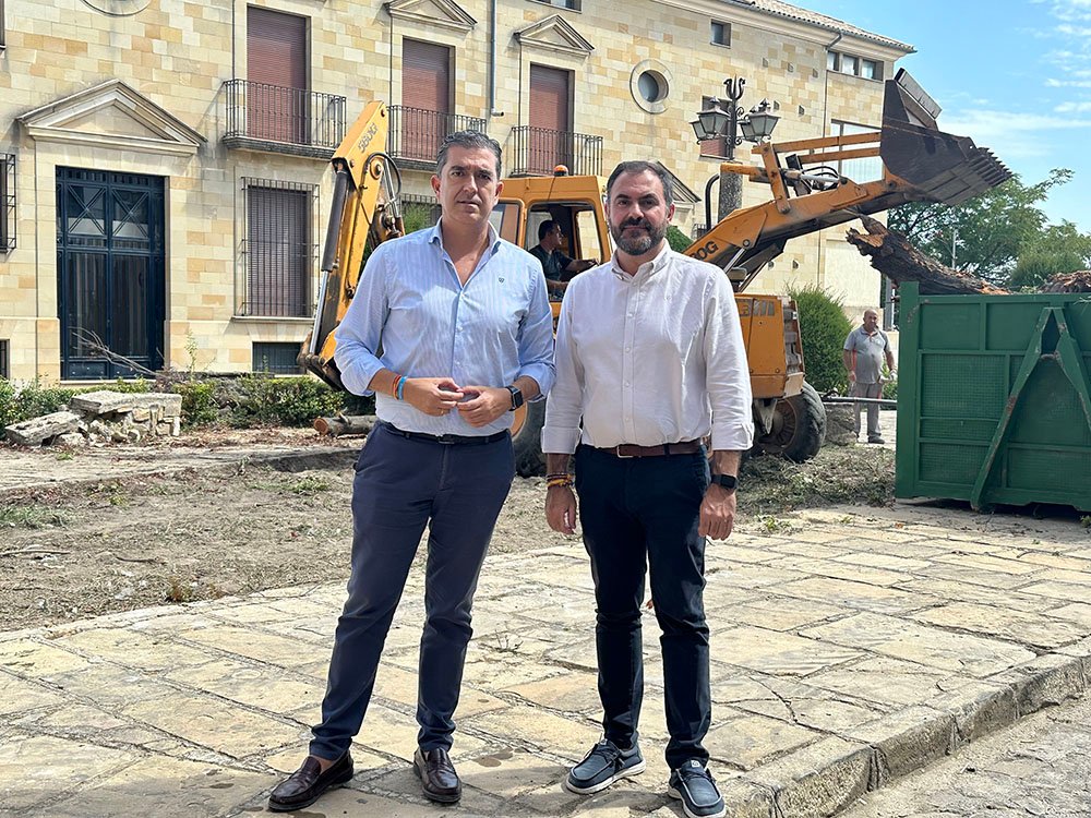 El alcalde de Baeza, Pedro Cabrera, acompañado de Antonio Jesús Ruiz, concejal de Medio Ambiente, se han trasladado hasta la plaza de los Comuneros, para dar cuenta de las diferentes actuaciones que desde la mencionada concejalía se están llevando a cabo.