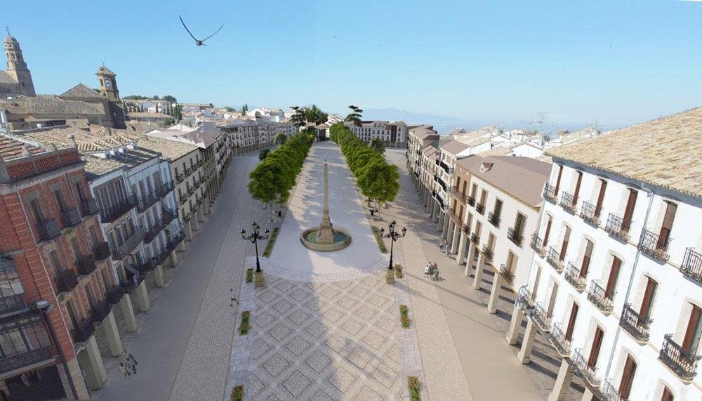 La actuación pretende la mejora de la funcionalidad de la plaza actual, renovando sus materiales, mejorando la accesibilidad, así como la generación de un espacio abierto con un único nivel consiguiendo plataforma única -quedará un desnivel aproximado de un 2%- ampliando la superficie de la plaza. La pavimentación se realizará con mármol ‘Sierra Elvira’ en el salón y baldosas de piedra arenisca calcárea ‘piedra dorada’ o ‘piedra de Baeza’ en dos formatos, para distinguir la zona de paseo y tráfico rodado.
